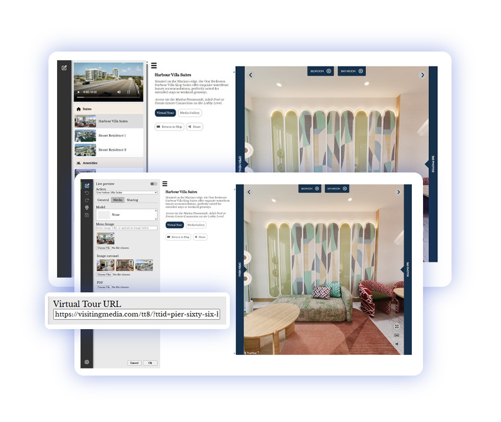 A lot of time and money goes into the production of photos, videos and virtual tours so we wanted to ensure that Visrez clients could use all their visual assets within the property map. Users can add YouTube videos, Matterport Virtual Tours or any other media to the interactive maps just by pasting the code into the editor.